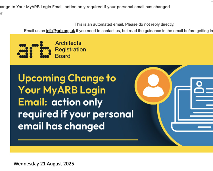 Following the email we sent on Thursday 21 August, we will be updating your MyARB login details. On 1 September 2025, we will automatically update the email address that you use to login to your MyARB profile to match the personal email address that we use to communicate with you.