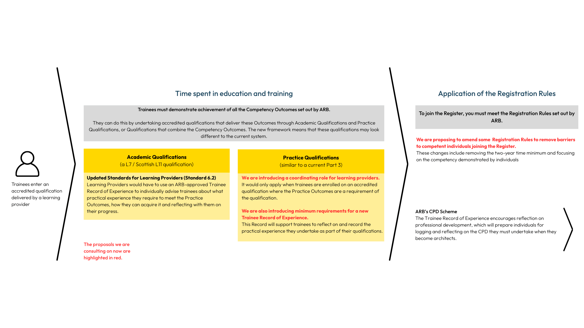 The proposed changes to the Standards and Handbook include that learning providers should use an ARB approved record to individually advise trainees on their progress.